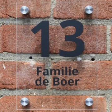 Naambordje me huisnummer strak, modern en staand model uit glashelder of frost helder gegoten acrylaat met zwarte tekst en/of huisnummer. Het naambord wordt inclusief montagemiddelen geleverd. Dit op maat gemaakte en gepersonaliseerd naambord maken wij geheel in eigen productie, hierdoor kunnen wij een snelle levering en kwalitatief goed product waarborgen.