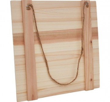 Het vierkante bord met de afmetingen 29 cm breedte, 29 cm lengte en 1,5 cm diepte heeft een Jute lint voor het ophangen van de houten plaat.