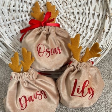 Elke fluwelen zakje is ontworpen met een gewei, ze zijn zeer geschikt als decoratie voor in de kerstboom, ook leuk als cadeauzakje met de kerstdagen.