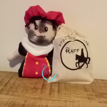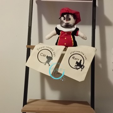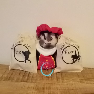 De pepernotenzakjes zijn verkrijgbaar in witte katoenen zakjes met trekkoord. Afmeting is 15x20.